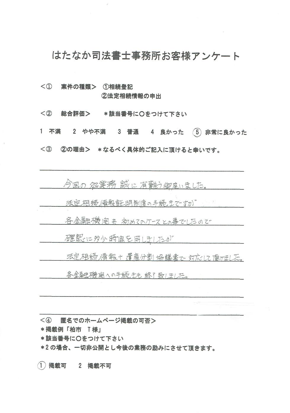 法定相続情報証明制度が始まってからすぐのご依頼でしたが、少しでもT様のお役に